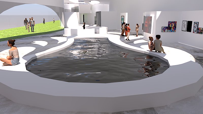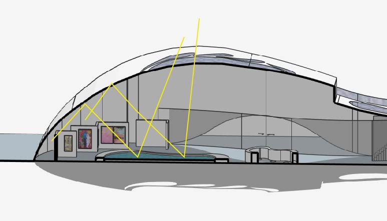 The window design on the top of the gallery is used for indirect lighting that occurs when sun rays bounce off the water feature located in the center of the gallery.